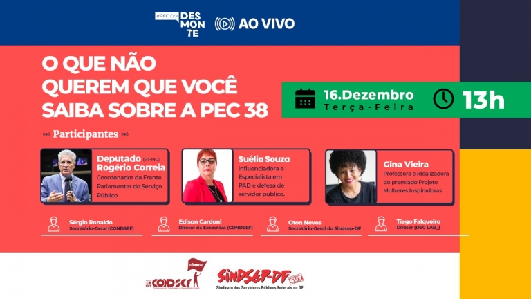 A Condsef e o Sindsep-DF realizam nesta terça-feira (16), a partir das 13h, uma transmissão ao vivo com debate técnico-estratégico sobre a Proposta de Emenda à Constituição nº 38/2025, conhecida como Reforma Administrativa ou “PEC do Desmonte”. A live contará com a participação de influenciadoras, parlamentares e lideranças sindicais e será transmitida nos canais da Condsef no YouTube, X e Instagram, além do Instagram do Sindsep-DF.